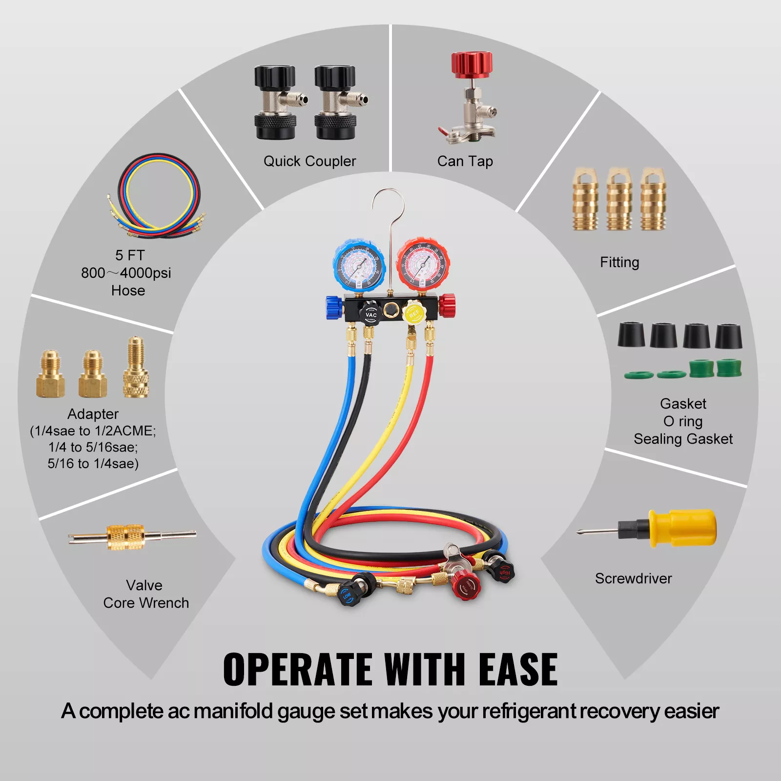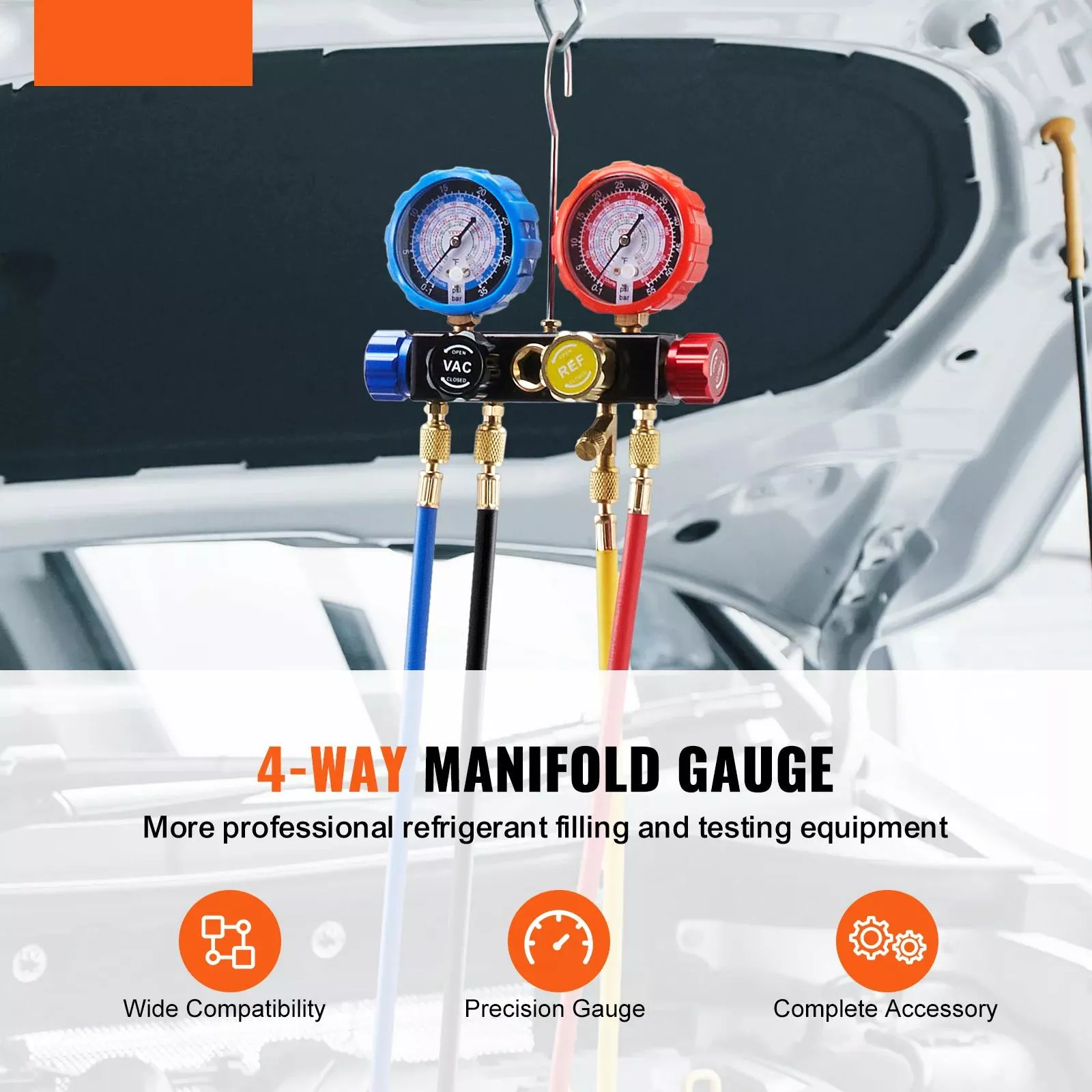 This manifold gauge set is a game-changer. With its 4-way system and compatibility with multiple refrigerants, it's the epitome of convenience and efficiency. The 5ft hoses are an added bonus, providing great reach in tight spaces.